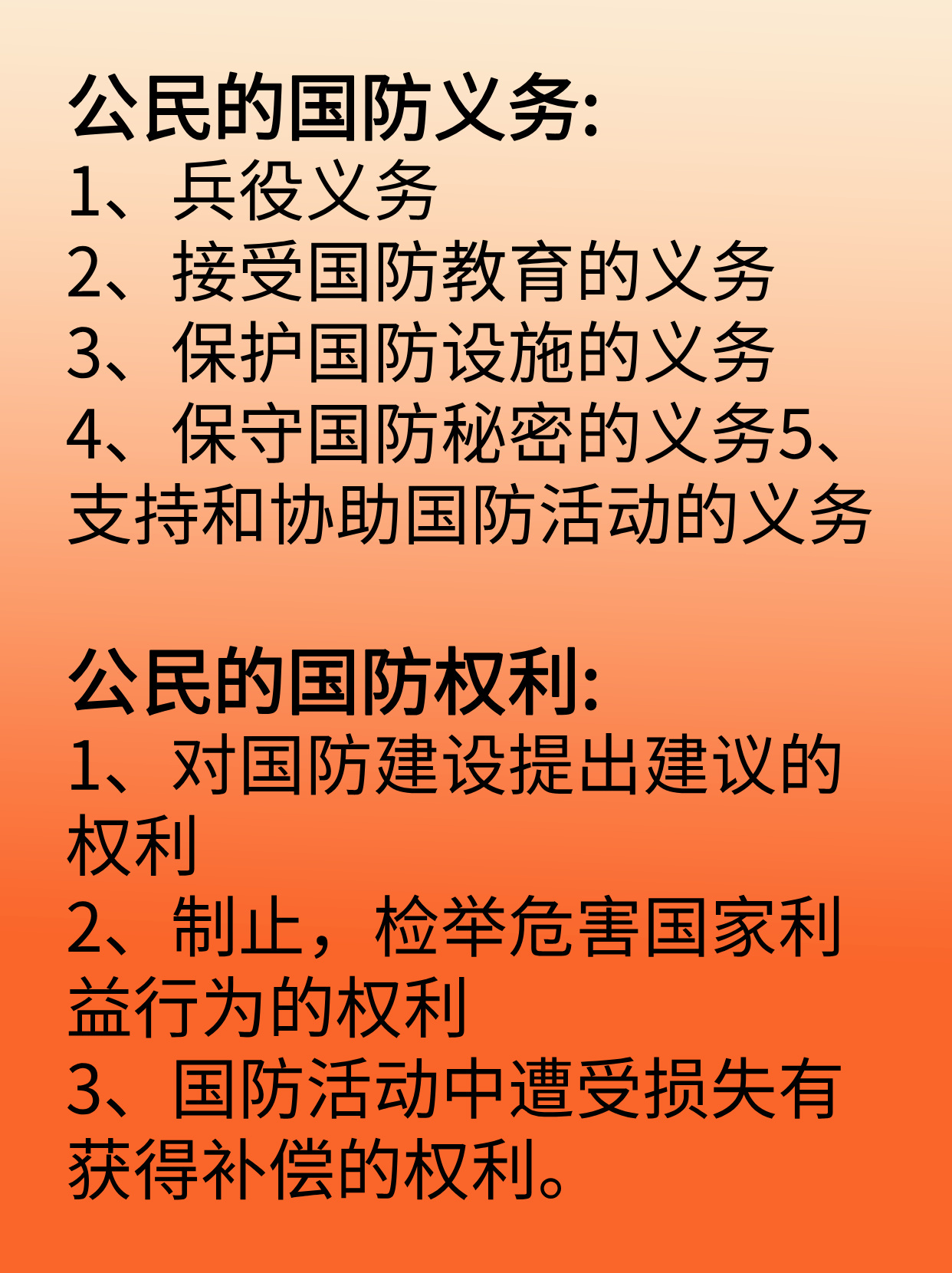在全球化日益发展的今天,国家安全面临着新的挑战和威胁,我们更应该加强国防建设,提高公民的国防意识,履行国防义务,我们才能保卫我们的国家,实现中华民族的伟大复兴。