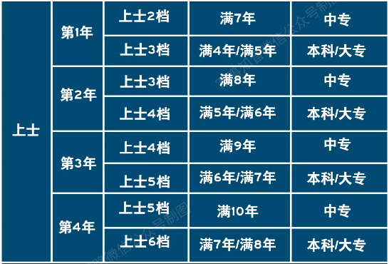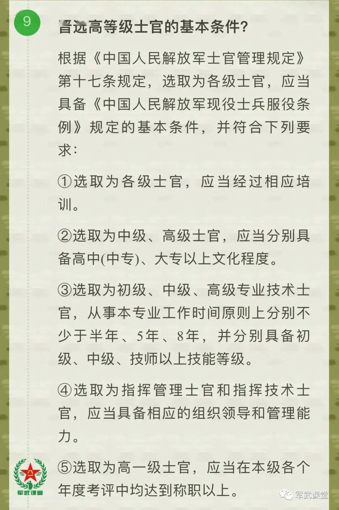 晋升中级士官通常要求具备高中及以上学历,鼓励士兵通过自学、继续教育等途径提高学历。