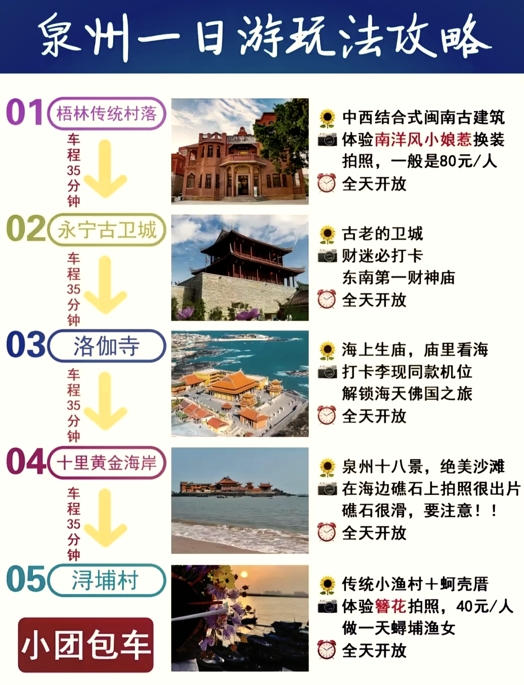 4、提前规划:由于泉州的历史遗迹较多,建议提前规划好行程路线,以免浪费宝贵的时间,可以提前了解景点的开放时间和门票价格等信息,还可以提前预订门票和酒店等,总之要提前做好攻略哦!最后提醒大家在游玩过程中要注意保持环境整洁和尊重当地的风俗习惯和文化传统哦!希望这份攻略能帮助你在泉州留下美好的回忆!让我们一起踏上泉州一日游的最佳路线吧!享受这座文化名城的魅力吧!