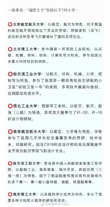 国防七子指的是中国七所顶尖国防科技大学的优秀毕业生,包括清华大学、北京航空航天大学等,这些学校的毕业生在军事科技领域具有很高的声誉,为国家培养了大批优秀的军事人才,他们不仅在军事领域有所建树,还在科技研发、教育等多个领域取得了显著成就。